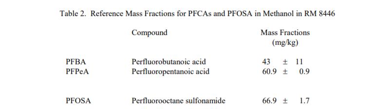PFCA 和 PFOSA 的參考質(zhì)量分?jǐn)?shù):表 1 中給出了參考質(zhì)量分?jǐn)?shù)值甲醇中的 PFCA 和表 2 中甲醇中的 PFCA 和 PFOSA。這些值基于從溶液的重量法制備獲得的結(jié)果和使用液相色譜法確定的分析結(jié)果。參考值是對(duì)真實(shí)值的最佳估計(jì)的非認(rèn)證值;但是,這些值不符合 NIST 認(rèn)證標(biāo)準(zhǔn),并且提供了可能反映的相關(guān)不確定性僅測(cè)量精度,可能不包括所有不確定性來源,或者可能反映多種分析方法之間缺乏足夠的統(tǒng)計(jì)一致性 [1]。