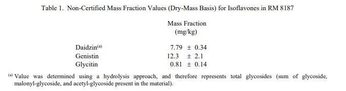 RM 8187 中異黃酮(作為總糖苷)的非認證質量分數值見表 1??偟鞍踪|量分數值 (%) 的非認證值見表 1。表 2. 非認證值是根據現有數據對真實值的最佳估計;但是,這些值不符合 NIST 認證標準 [1],并且提供了相關的不確定性,這些不確定性可能僅反映測量再現性,可能不包括所有不確定性來源,或者可能反映多種分析方法之間缺乏足夠的統計一致性。賦值分析由 NIST 進行,非認證值計算為 NIST 方法平均值的等權重平均值。相關的不確定性以 95% 的置信水平表示 [2-4]。以質量分數單位 [5] 以干質量為基礎報告值。非認證值可追溯到 NIST 或合同實驗室使用的測量過程和標準