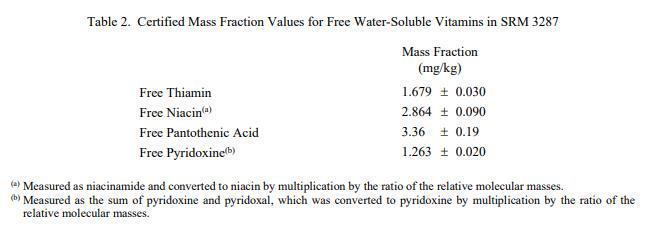 表 1 至表 3 提供了 SRM 3287 中奎尼酸、游離水溶性維生素和元素的認證質(zhì)量分數(shù)值,以干質(zhì)量為基礎(chǔ)報告。NIST 認證值是NIST 對其準確性的信心最高,因為所有已知或可疑的偏差來源都已考慮在內(nèi) [1]。價值分配分析由 NIST 和合作實驗室進行。