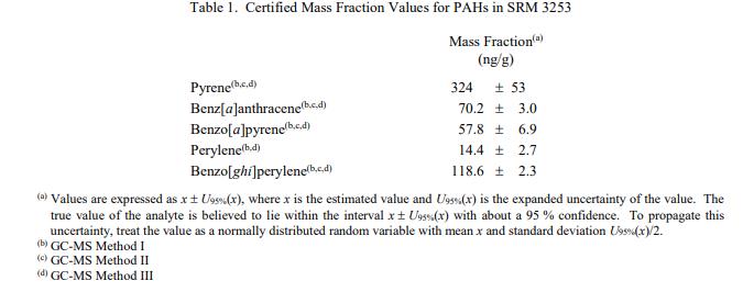 表 1 提供了以干質量為基礎報告的選定 PAH 的認證質量分數值。NIST 認證值是 NIST 對其準確度具有最高置信度的值,在所有已知或懷疑的偏差的來源已被調查或考慮 [1]。 NIST 進行了賦值分析;認證值計算為 NIST 方法平均值的未加權平均值。相關的不確定性以大約 95% 的置信水平表示 [2-4]。
