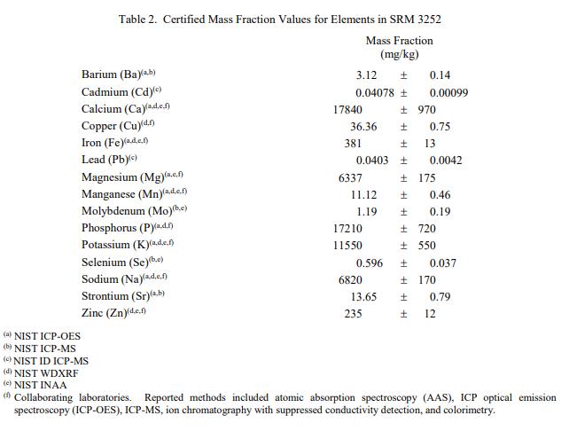 使用方法:使用前,應(yīng)將包中的內(nèi)容物充分混合。打開前應(yīng)讓內(nèi)容物靜置一分鐘,以盡量減少細(xì)顆粒的損失。對(duì)于小于以下 NIST 方法使用的樣本大小,尚未評(píng)估材料的均勻性。因此,認(rèn)證值和參考值對(duì)于小于以下部分所述的測試部分可能無效:元素分析 0.2 克至 4 克,脂肪酸分析 1 克,膽固醇分析 0.5 克,以及 1 克至 5 克g 用于維生素分析。在分析中獲得的結(jié)果應(yīng)該包括他們自己對(duì)不確定性的估計(jì),并且可以使用參考 5 中描述的程序與認(rèn)證值進(jìn)行比較。 水分測定:SRM 3252 的水分含量在 NIST 通過 (1) 冷凍干燥至恒定質(zhì)量超過7天; (2) 用高氯酸鎂在干燥器中室溫干燥20 d; (3) 在 80 ℃的強(qiáng)制通風(fēng)烘箱中干燥 3 h。對(duì)所有三種技術(shù)的平均結(jié)果進(jìn)行平均,以確定每克原樣質(zhì)量的 (0.9502 ± 0.0038) 克干質(zhì)量比例;此值上顯示的不確定性是大約 95% 置信水平的擴(kuò)展不確定性。用于將數(shù)據(jù)從原樣轉(zhuǎn)換為干質(zhì)量基礎(chǔ)的轉(zhuǎn)換因子是干質(zhì)量比例的倒數(shù)。從水分測量中獲得的轉(zhuǎn)換因子 (0.2 %) 的相對(duì)不確定度部分包含在認(rèn)證值和參考值的不確定度中,以干質(zhì)量為基礎(chǔ)報(bào)告,在本證書中提供。