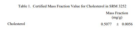 表 1 至表 3 中提供了 SRM 3252 中膽固醇、元素和維生素的認(rèn)證質(zhì)量分?jǐn)?shù)值,以干質(zhì)量為基礎(chǔ)報(bào)告。NIST 認(rèn)證值是 NIST 認(rèn)證的值對(duì)其準(zhǔn)確性的信心最高,因?yàn)樗幸阎蚩梢傻钠詈涂勺冃詠碓炊家芽紤]在內(nèi) [1]。價(jià)值分配分析由 NIST 和合作實(shí)驗(yàn)室進(jìn)行。認(rèn)證值計(jì)算為 NIST 方法的平均值和合作實(shí)驗(yàn)室提供的平均結(jié)果的中位數(shù)(在適當(dāng)?shù)那闆r下)。相關(guān)的不確定性以大約 95% 的置信水平表示 [2-4]。