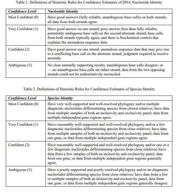 經(jīng)認(rèn)證的物種鑒定是銀杏,來自 psbA-trnH 基因間間隔區(qū)和 trnL 內(nèi)含子區(qū)域的相關(guān)葉綠體 DNA 序列可在伴隨的 FASTA 格式文件中獲得 [1]。與序列中每個核苷酸相關(guān)的不確定性,以及與作為物種標(biāo)識符的 DNA 序列相關(guān)的不確定性,以表示對規(guī)定值的信念強度的序數(shù)尺度表示(0 = 最有信心,1 = 非常有信心,2 = 有信心,3 = 模棱兩可)(表 1 和表 2)[2]。