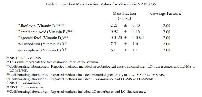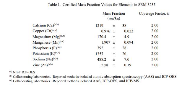 表 1 和表 2 提供了 SRM 3235 中元素和維生素的認(rèn)證質(zhì)量分?jǐn)?shù)值,按原樣報(bào)告,在表 1 和表 2 中提供。 NIST 認(rèn)證值是 NIST 對(duì)其最有信心的值準(zhǔn)確性,因?yàn)樗幸阎蚩梢傻钠顏?lái)源都已被調(diào)查或考慮到[1]。價(jià)值分配分析由 NIST 和合作實(shí)驗(yàn)室進(jìn)行。認(rèn)證值被計(jì)算為 NIST 方法的平均值和合作實(shí)驗(yàn)室提供的結(jié)果平均值的中位數(shù)或平均值(在適當(dāng)?shù)那闆r下)。相關(guān)的不確定性以大約 95% 的置信水平表示 [2-4]。