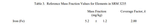 表 3 至表 7 提供了NIST SRM 3235豆奶(標(biāo)準(zhǔn)品) 中鐵、其他維生素、近似物和卡路里、脂肪酸和氨基酸的參考質(zhì)量分?jǐn)?shù)值,按原樣報(bào)告。NIST 參考值是未經(jīng)認(rèn)證的值,它是基于可用數(shù)據(jù)對(duì)真實(shí)值的最佳估計(jì);但是,該值不符合 NIST 的認(rèn)證標(biāo)準(zhǔn) [1],并帶有相關(guān)的不確定性,這些不確定性可能僅反映測(cè)量再現(xiàn)性,可能不包括所有不確定性來(lái)源,或者可能反映多種分析方法之間缺乏足夠的統(tǒng)計(jì)一致性。參考質(zhì)量分?jǐn)?shù)值來(lái)自 NIST 和/或合作實(shí)驗(yàn)室報(bào)告的結(jié)果
