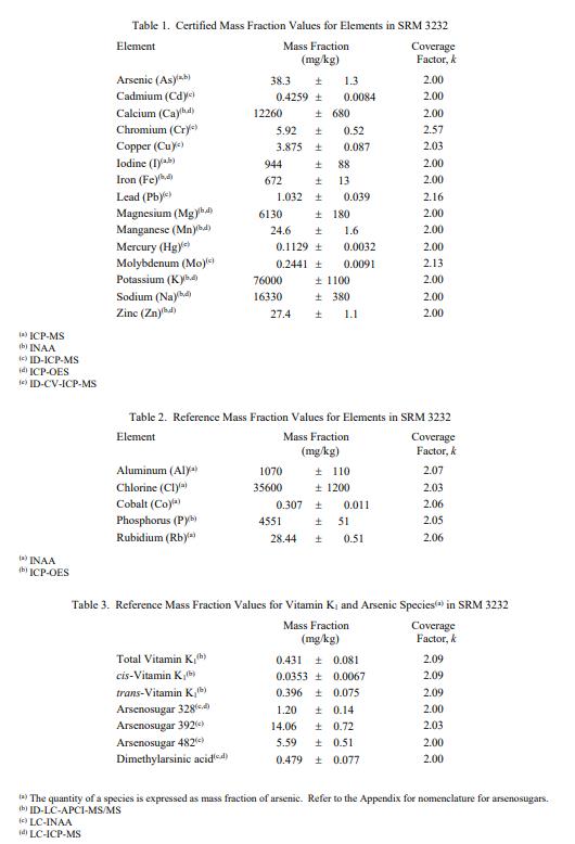 元素測(cè)定:SRM 3232 中元素質(zhì)量分?jǐn)?shù)的賦值基于 NIST 測(cè)量,使用電感耦合等離子體發(fā)射光譜法 (ICP-OES)、電感耦合等離子體質(zhì)譜法 (ICP-MS)、同位素稀釋 ICP-MS (ID-ICP-MS)、同位素稀釋冷蒸氣生成ICP-MS (ID-CV-ICP-MS) 和儀器中子活化分析(INAA)。