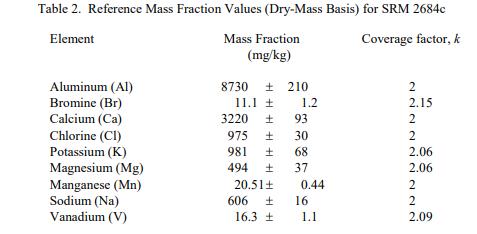 表 2 中提供了鋁、溴、鈣、氯、鎂、錳、鉀、鈉和釩的參考值,以基于干質量的質量分數 [1] 表示。參考值是對真實價值的最佳估計的非核證價值;然而,價值不符合NIST 認證標準,并提供了相關的不確定性,該不確定性可能僅反映測量精度,可能不包括所有不確定性來源 [2]。