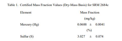 表 1 中提供了汞和硫的認證值,以基于干質量的質量分數 [1] 表示。NIST 認證值是 NIST 對其準確性有最高置信度的值所有已知或可疑的偏見來源都已被調查或考慮帳戶 [2]。認證值是根據 NIST 和合作實驗室進行的分析結果對真實值的當前最佳估計。