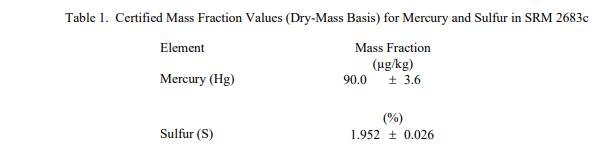 表 1 中提供了汞和硫的認證值,以基于干質量的質量分數 [1] 表示。汞認證值基于或直接溯源到單一 NIST 主要方法。 NIST 認證值是 NIST 對其準確性具有最高置信度的值,因為所有已知或可疑的偏差來源都已被調查或考慮在內 [2]。