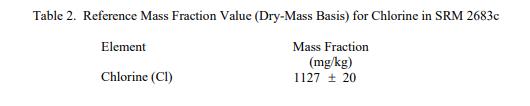 表 2 中提供了氯的參考值,表示為基于干質量的質量分數 [1]。參考值是非認證值,是對真實值的最佳估計;但是,該值不符合 NIST 的認證標準,并且提供了相關的不確定性,該不確定性可能僅反映測量精度,可能不包括所有不確定性來源 [2]。