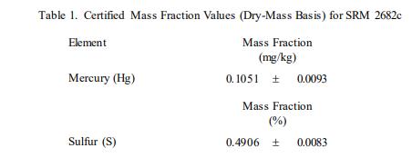 表 1 中提供了汞和硫的認證值,以基于干質量的質量分數 [1] 表示。NIST 認證值是 NIST 對其準確性有最高置信度的值所有已知或可疑的偏差來源都已被調查或考慮 [2]。認證值是對真實值的當前最佳估計。