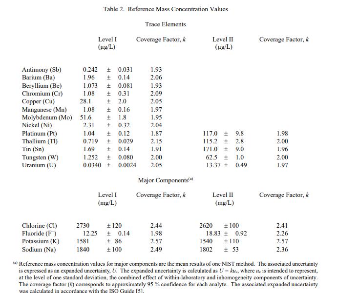 表 2 提供了 I 級 17 種元素和 II 級 9 種元素的參考質量濃度值。參考值是非認證值,是根據現有數據對真實值的最佳估計;但是,這些值不符合 NIST 認證標準 [1] 并且是提供了可能不包括所有不確定性來源的相關不確定性。
