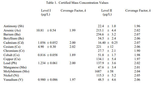 表 1 列出了 SRM 2668 的 I 級 6 種元素和 II 級 14 種元素的認證質量濃度值。 NIST 認證值是 NIST 對其準確性有最高信心的值已知或可疑的偏見來源已被調查或考慮帳戶 [1]。數值來自 NIST 和合作實驗室提供的結果的組合。