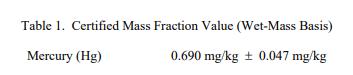 表 1 中提供了汞的認證值,表示為基于濕質量(原樣)的質量分數(shù) [1]。該值基于使用冷蒸氣同位素稀釋的主要方法進行的分析電感耦合等離子體質譜 (CV-ID-ICP-MS) [2,3]。 NIST 認證值是 NIST 對其準確性具有最高置信度的值,因為所有已知或可疑的偏差來源都已被調查或考慮 [4]。認證值的不確定度以擴展不確定度的形式給出,以大約 95% 的置信度覆蓋被測量。擴展的不確定性計算為 U = kuc 其中uc 是與 ISO/JCGM 指南 [5] 一致的組合不確定度,k 是對應于大約 95% 置信度的覆蓋因子 (k = 2)。被測量是表 1 中列出的汞的總質量分數(shù)。計量可溯源至 SI 派生的質量分數(shù)單位(以毫克每千克表示)