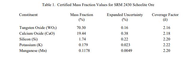 本標準參考物質 (SRM) 主要用于驗證分析含鎢礦石和其他類似基質材料的元素含量的化學和儀器方法。它可用于驗證內部參考資料的價值分配。 SRM 2430 的一個單元由一個裝有大約 100 克粉末的瓶子組成,這些粉末經過 150 目篩(< 0.1 毫米)研磨。