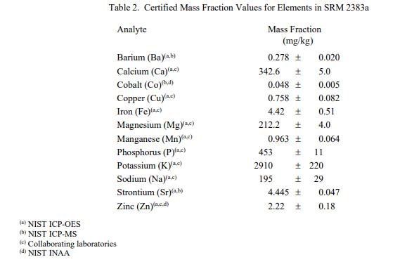 表 1 和表 2 中提供了 SRM 2383a 中類胡蘿卜素和元素的認證質量分數值,按原樣報告。NIST 認證值是 NIST 對其準確性有最高置信度的值因為所有已知或可疑的偏見來源都已被調查或考慮到[1]。價值分配分析由 NIST 和合作實驗室進行。認證值計算為 NIST 方法平均值的未加權平均值和合作實驗室提供的結果平均值的中位數(如果適用)。相關的不確定性以大約 95% 的置信水平表示 [2-4]。