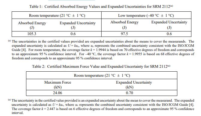 NIST 認證值是 NIST 對其準確性有最高置信度的值,因為所有已知或可疑的偏差來源都已被調查或考慮 [3]。可追溯性是國際單位制 (SI) 焦耳(吸收的能量)和千牛頓(力)單位。為 SRM 2112 樣品確定的認證值在表 1 和表 2 中給出。