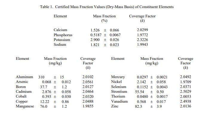 表 1 中提供了以干質(zhì)量為基礎(chǔ)報(bào)告的選定組成元素的認(rèn)證質(zhì)量分?jǐn)?shù)值。NIST 認(rèn)證值是 NIST 對(duì)其準(zhǔn)確性有最高置信度的值,在所有已知或已調(diào)查或考慮了可疑的偏見來(lái)源帳戶 [1]。