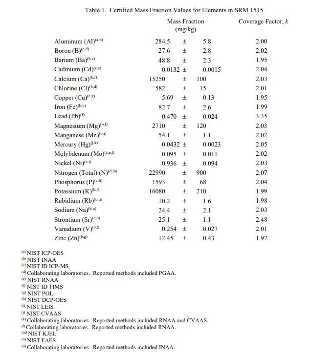 表 1 中提供了 SRM 1515 中元素的認證質量分數值,以干質量為基礎報告。NIST 認證值是 NIST 對其準確性有最高置信度的值或懷疑的偏倚來源已被調查或考慮[1]。價值分配分析由 NIST 和合作實驗室進行。認證值是使用