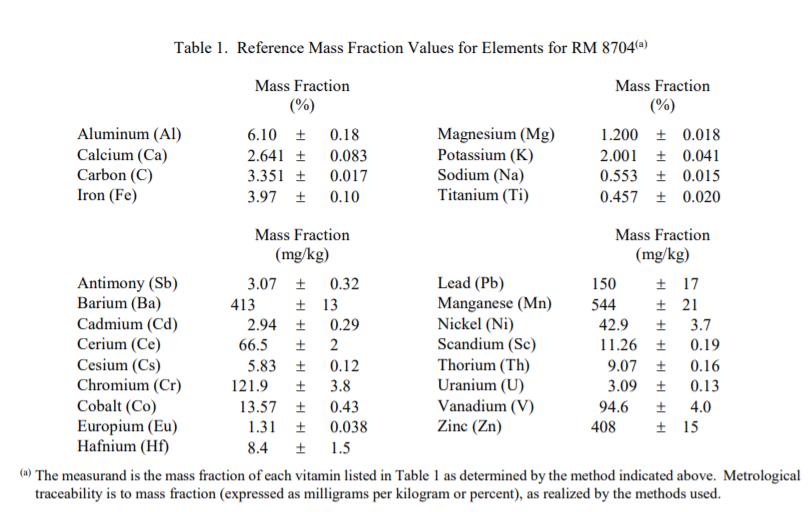 表 1 給出了 25 種元素質量分數的參考值。參考值是非認證值,是對真實值的最佳估計;但是,這些值不符合 NIST 認證標準,并且提供了相關的不確定性,可能不包括所有不確定性來源 [1]。